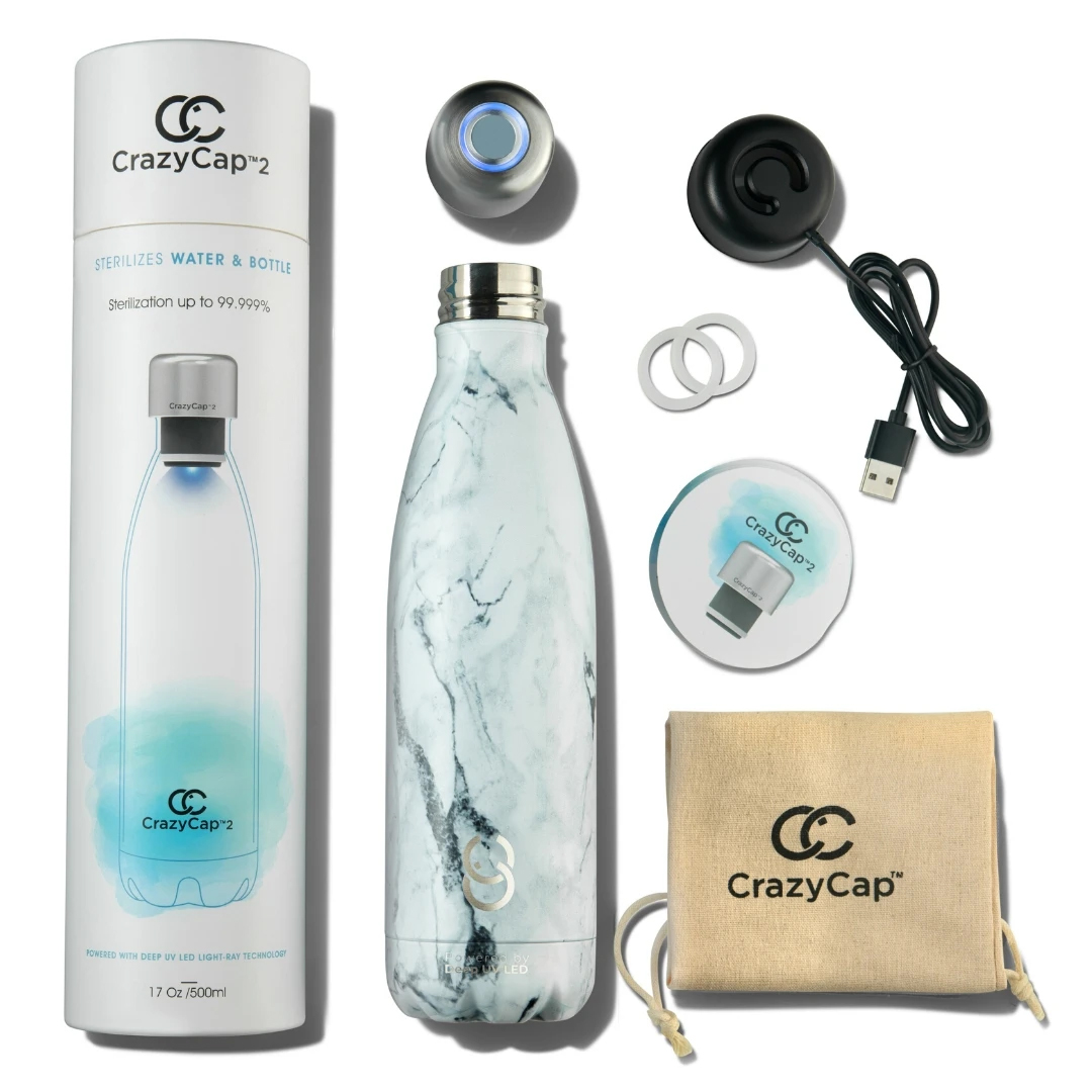 CrazyCap is a one of a kind of bottle with a built-in deep UV LED light to purify water on-the-go. The light also self-cleans your bottle so you don’t have to. CrazyCap prevents mold growth in your bottle and keeps your bottle always smelling fresh. CrazyCap is perfect for everyday use and travel. With CrazyCap, you can ensure clean drinkable at the convenience of your fingertips. Don’t waste your money on buying expensive bottled water. CrazyCap is a one-time investment which will last years. Its built-in LED has a ten year lifespan.